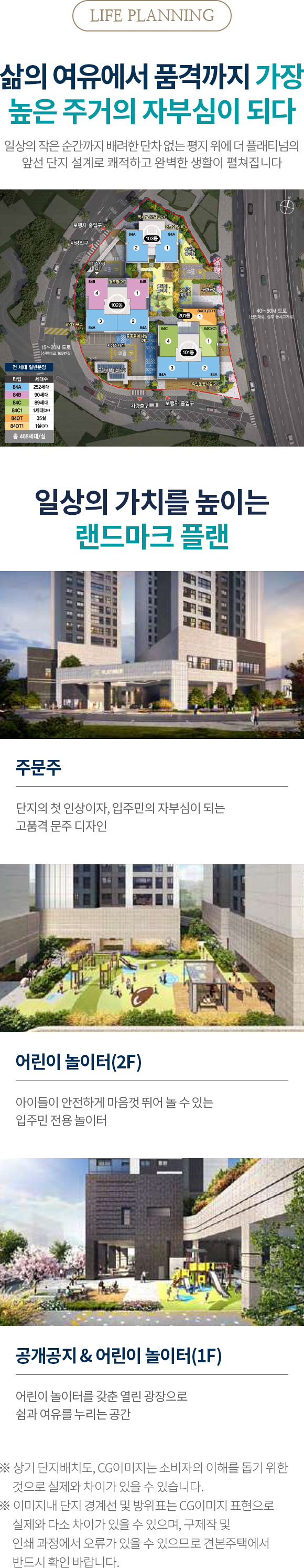 단지배치도 페이지에서는 동 배치, 조경 계획, 단지 동선, 주요 커뮤니티 시설의 위치 등을 한눈에 확인할 수 있습니다. 세대 간격과 조망 확보, 일조권, 주민 이동 동선 등이 고려된 설계로 실제 주거 생활의 효율성과 쾌적성을 높였습니다. 조경 요소와 커뮤니티 공간이 자연스럽게 연결되어 단지 내부에서의 생활 만족도를 높이는 구조를 갖추고 있으며, 입주민의 편의성을 중심에 둔 실용적인 단지 설계가 특징입니다.